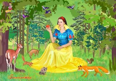 Персонажи: Белоснежка, Гном и Королева-мачеха. Количество персонажей может быть уменьшено до 1-го.