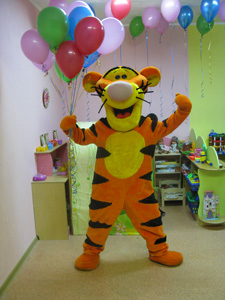 Ростовая кукла с подарком появляется на пороге Именниника, произносит поздравление и вручает заранее приготовленные подарки.